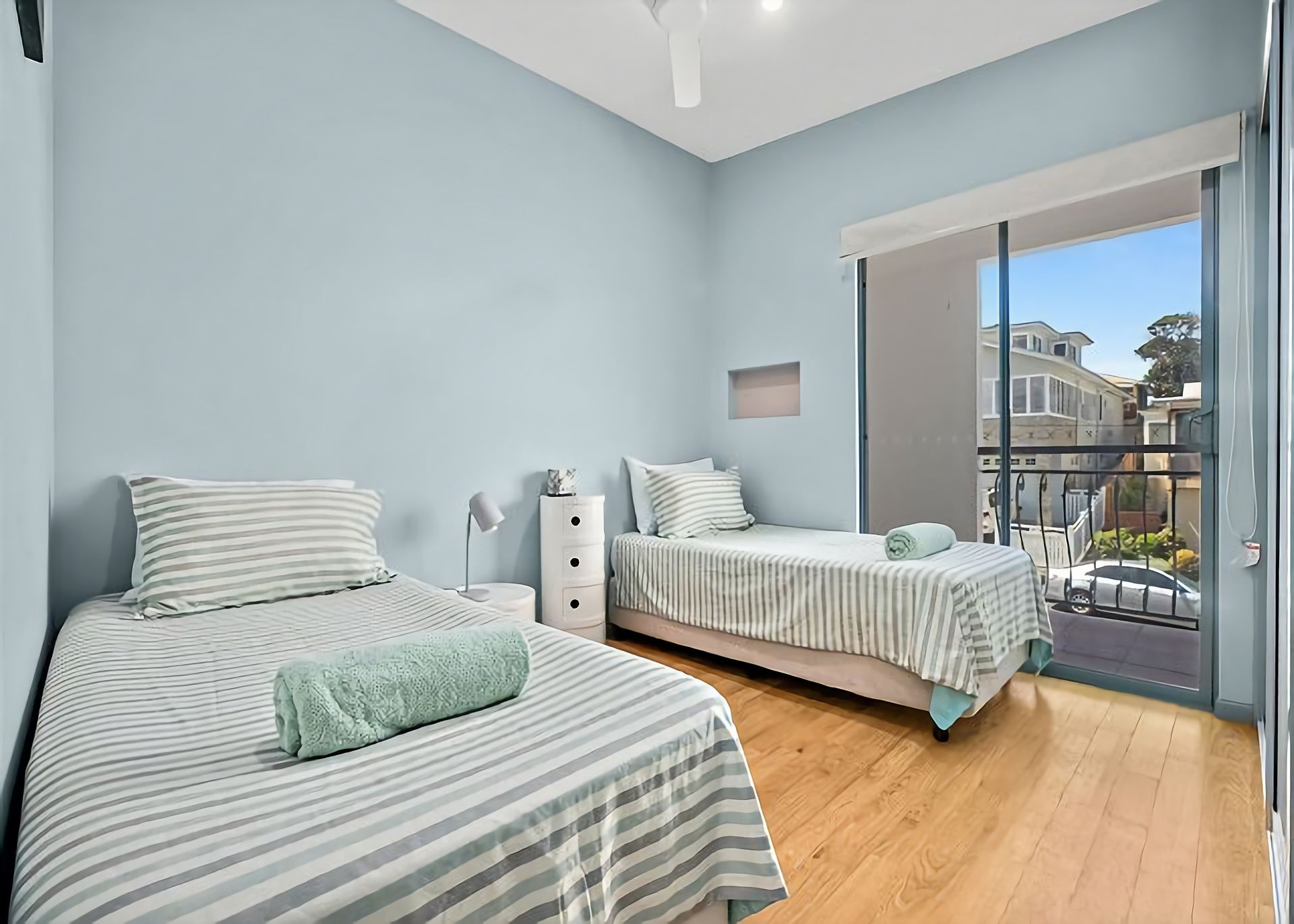 Bedroom Three: Two Single beds, ceiling fan and balcony