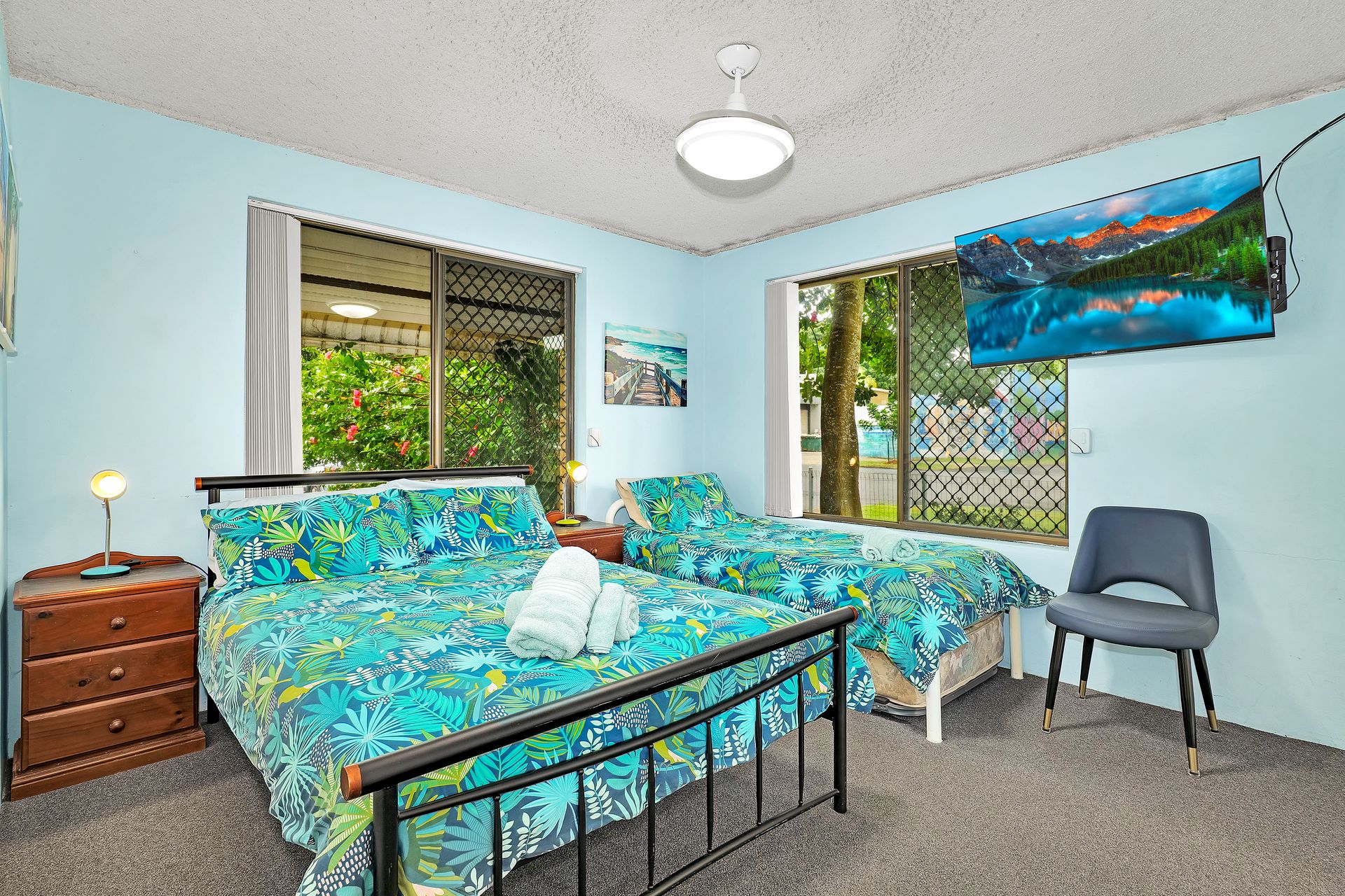 Bedroom Two: Double Bed and Single bed, ceiling fans, TV and built-in robe.