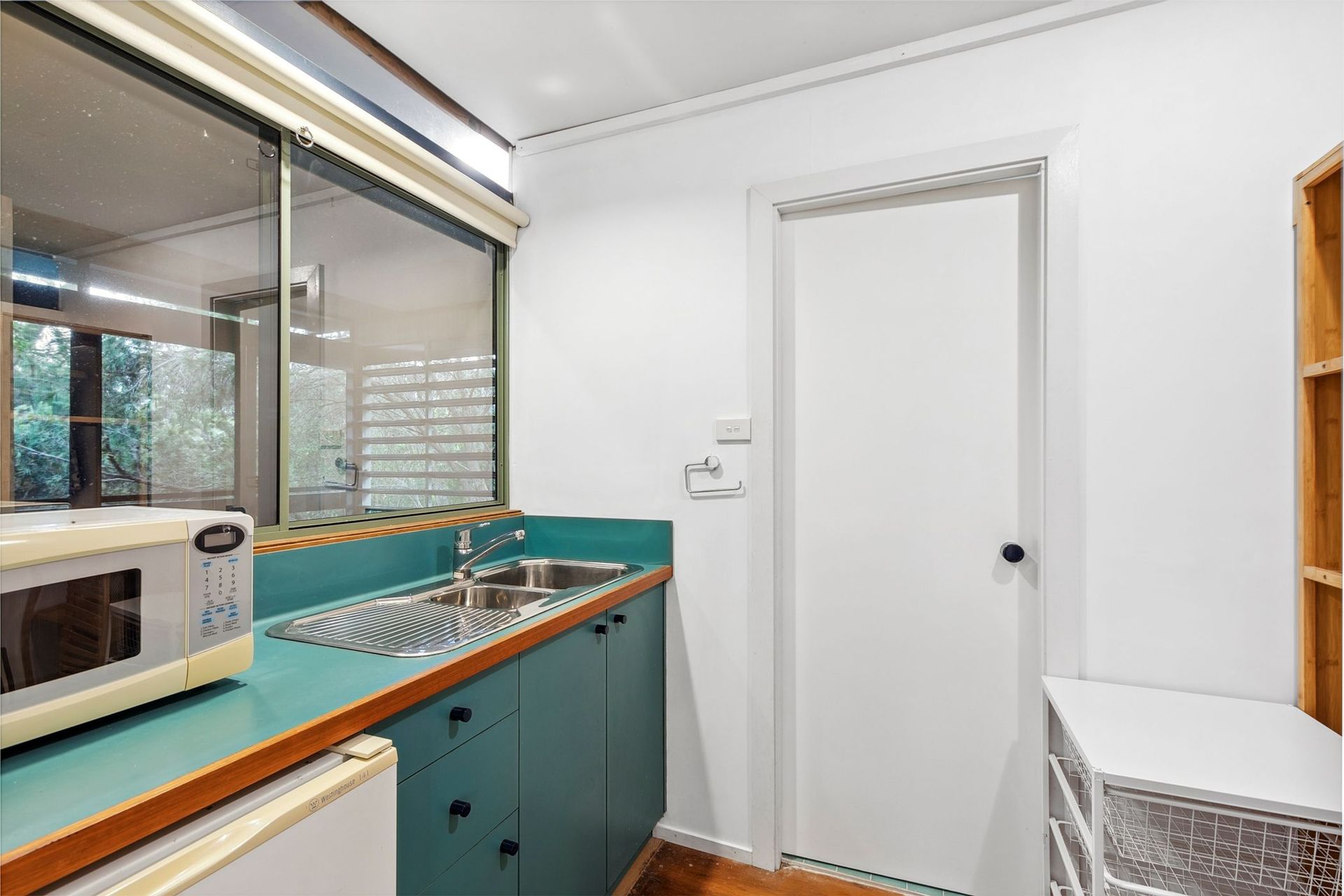 A functionally equipped kitchen with a microwave/convection oven